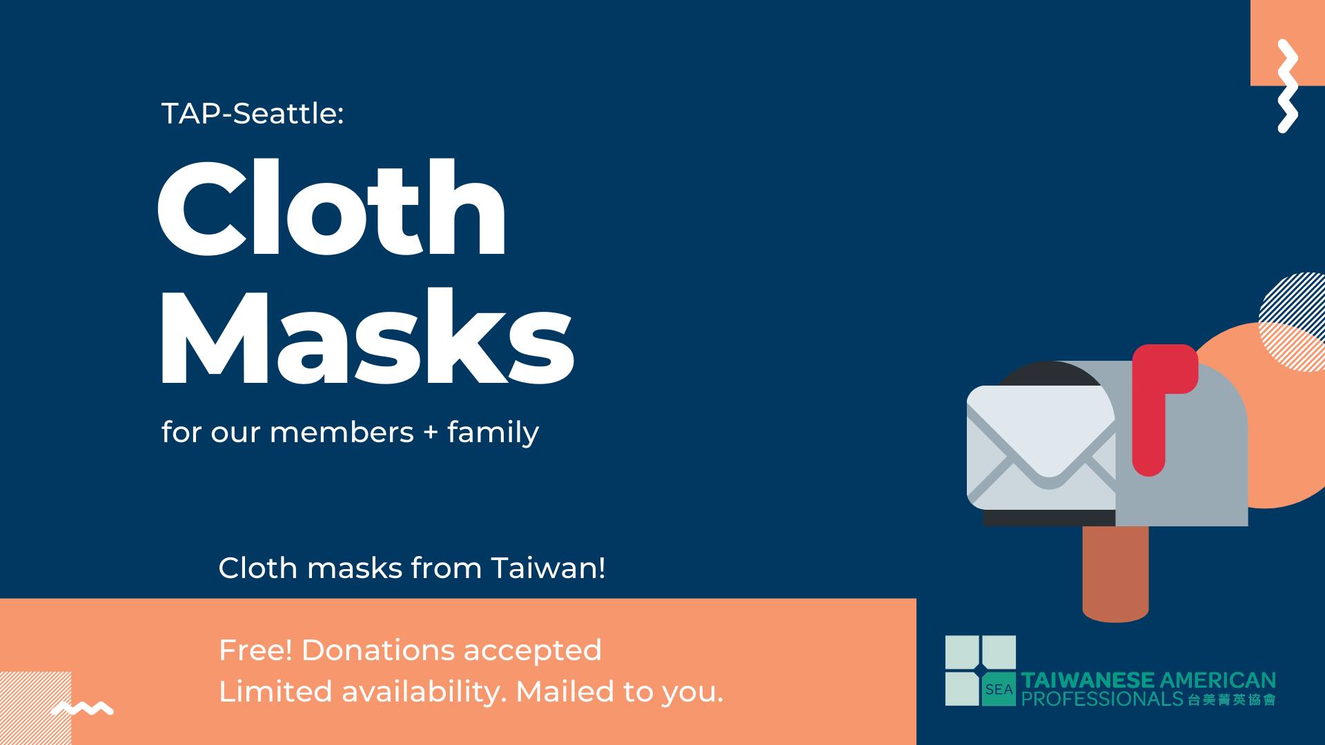 TAP-Seattle ordered cloth masks from Taiwan (through OCAC) for our members(you)! Keeping our members and their family safe is a top priority for us. If you want, please fill in the Eventbrite, and we will mail them to you (in the USA). They are free for you to claim. We are taking donations if you would like to contribute (venmo: @TAP-Seattle or paypal: @tap-seattle).