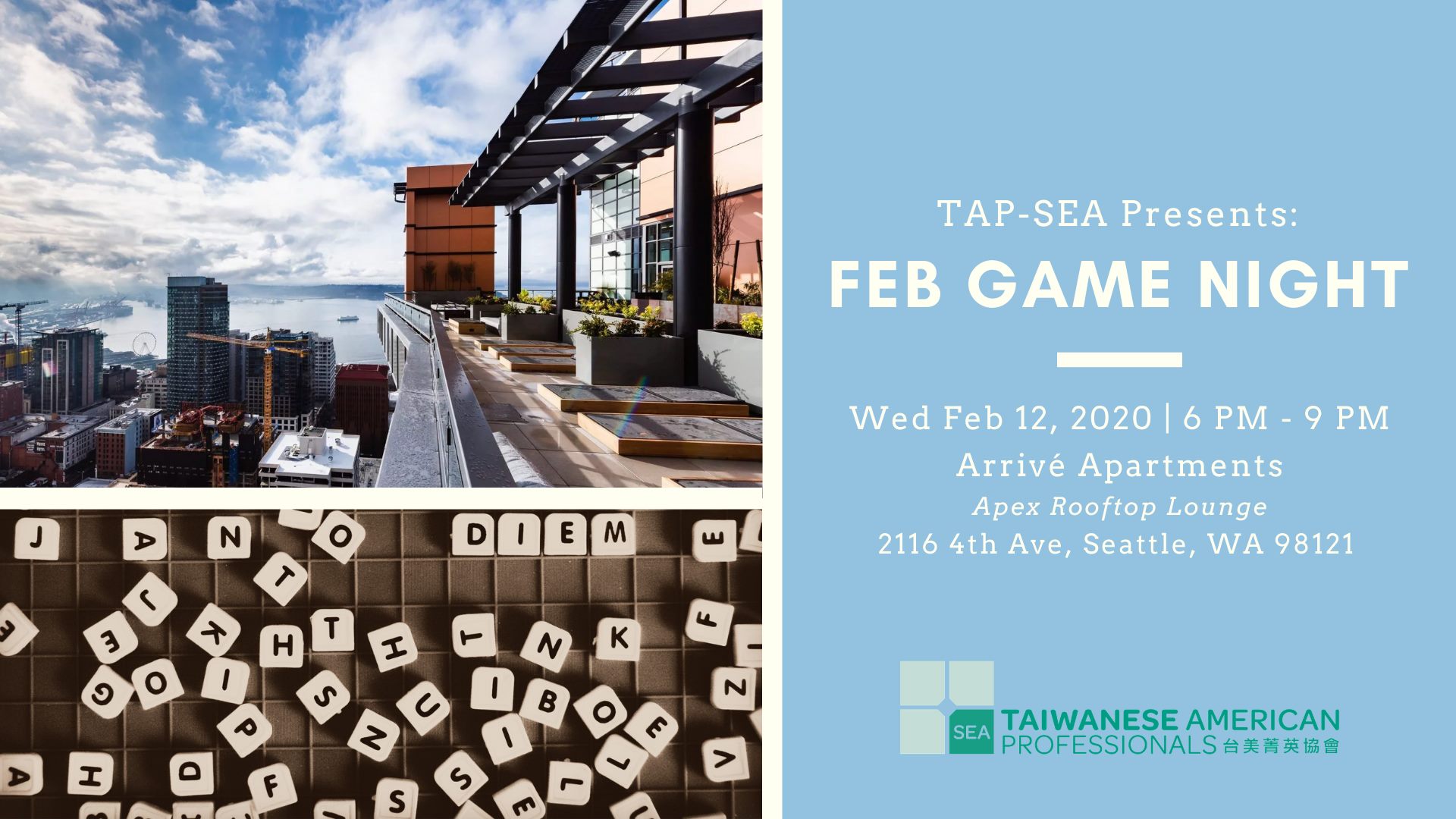 Mingle with other young professionals and play board games at a laid-back evening in the stunning rooftop Apex Lounge at Arrivé Apartments in downtown Seattle.